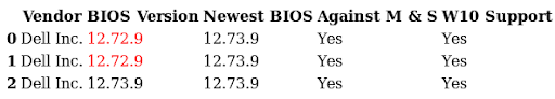 +----+--------------+------------+----------------+---------------+-----------------+---------------+-------------+------------+--------------+--------------+|| Type | Vendor | BIOS Version | Newest BIOS | Against M & S | W10 Support | Computer | Location | Category1 | Category2 ||----+--------------+------------+----------------+---------------+-----------------+---------------+-------------+------------+--------------+--------------||0| HexaPlex x50 | Dell Inc. |12.72.9|12.73.9| Yes | Yes | someName001 |12.72.9| SomeCategory | SomeCategory |||||12.72.9|||| someName002 |12.73.9|||||||12.73.9|||| someName003 |12.73.9|||+----+--------------+------------+----------------+---------------+-----------------+---------------+-------------+------------+--------------+--------------+